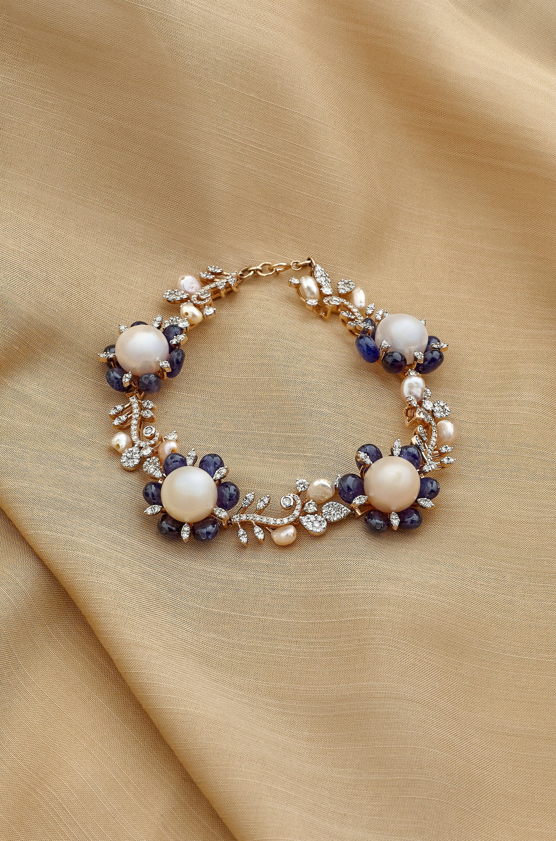 This exquisite bracelet is designed in a delicate flower motif, featuring lustrous pearls as the centerpiece,surrounded by vibrant blue Tanzanite and sparkling diamonds.