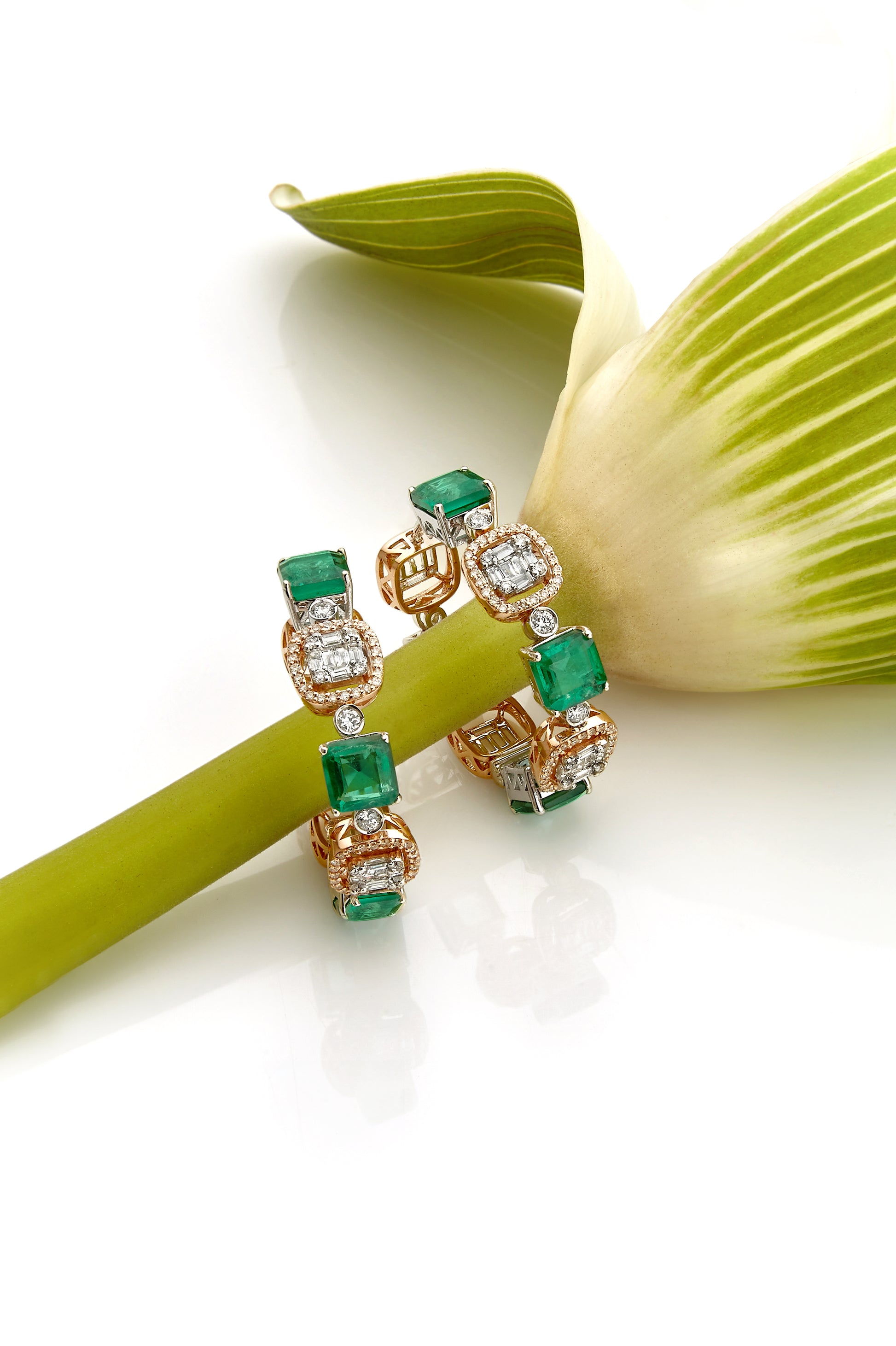 Playful hoops featuring alternating emeralds and diamonds in a sleek,modern design - bringing a touch of whimsy and elegance to any look.